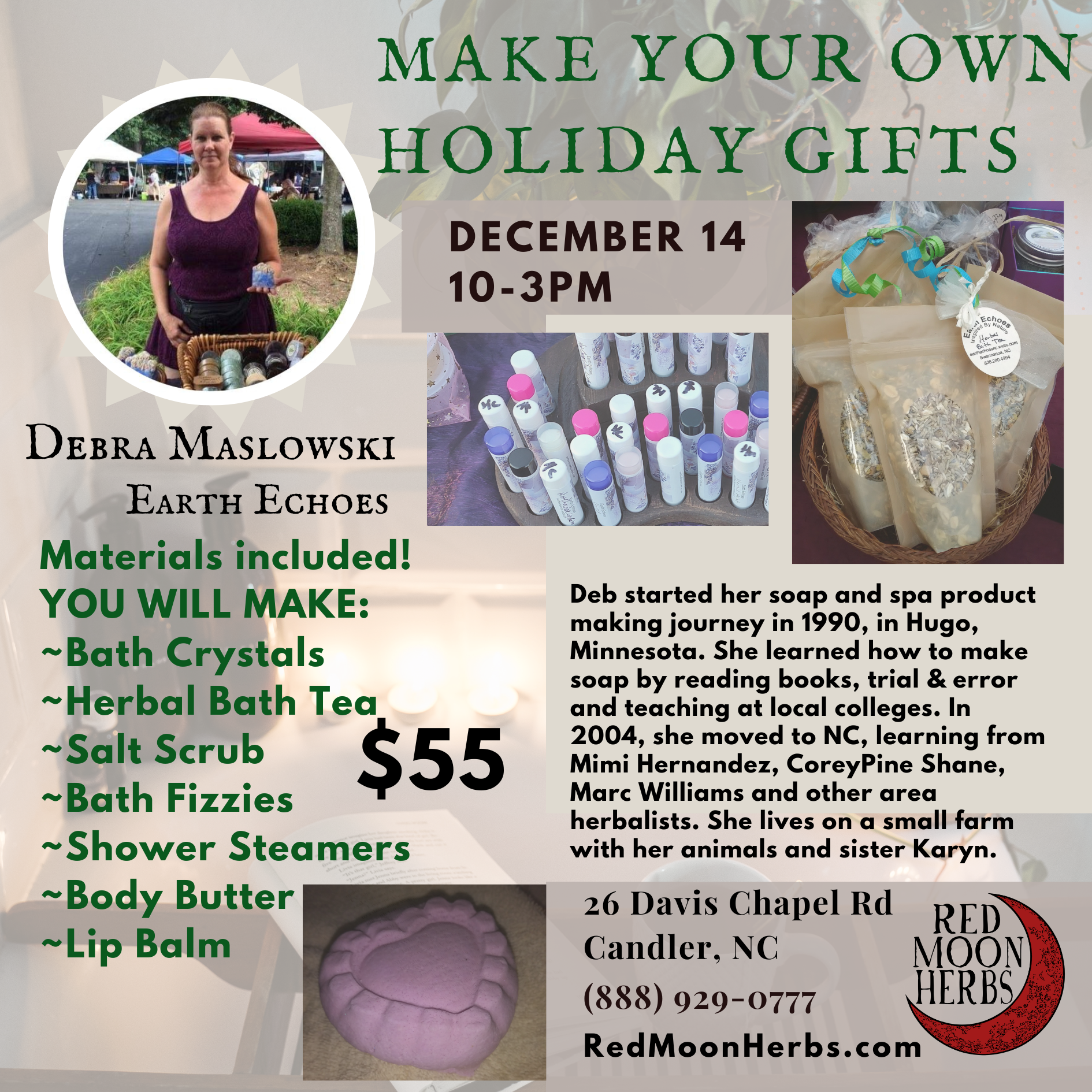 Join Debra Maslowski for an active day making your own holiday gifts for friends, family and yourself! Lunch and drinks provided but pack a lunch if you have special dietary concerns.